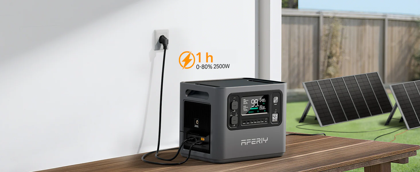 Herladen van uw AFERIY P280 van 0 tot 80% in slechts 1 uur dankzij de AC 1800 W ingang, instelbaar volgens uw behoeften (600 / 900 / 1200 / 1500 / 1800 W). In combinatie met AC-zonnepanelen, geniet u van een maximaal ingangsvermogen van 2500 W voor een volledig opladen in ongeveer 1,2 uur.